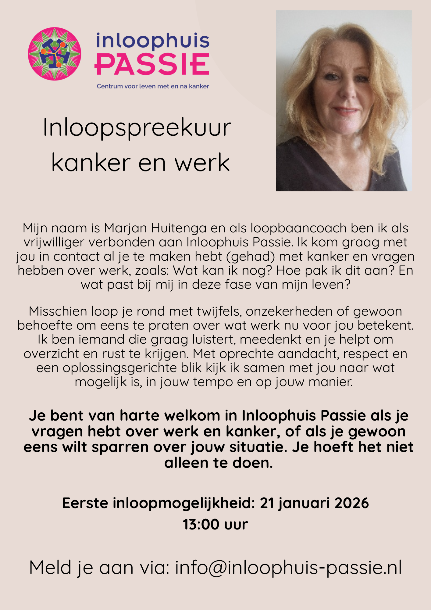 Mijn naam is Marjan Huitenga en als loopbaancoach ben ik als vrijwilliger verbonden aan Inloophuis Passie. Ik kom graag met jou in contact al je te maken hebt (gehad) met kanker en vragen hebben over werk, zoals: Wat kan ik nog? Hoe pak ik dit aan? En wat past bij mij in deze fase van mijn leven?