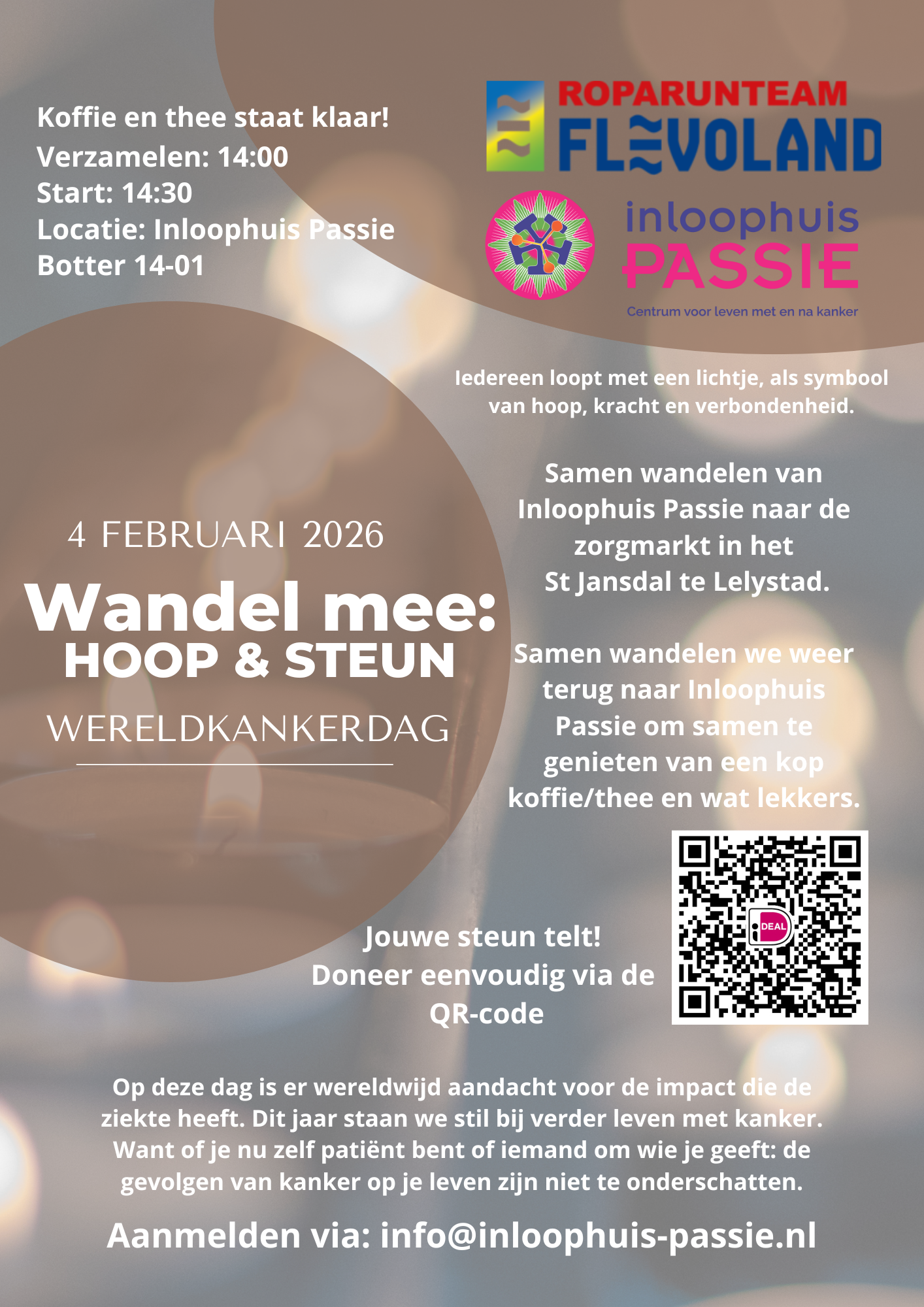 Op woensdag 4 februari 2026, Wereldkankerdag, organiseren Roparunteam Flevoland en Inloophuis Passie een bijzondere wandelactiviteit in Lelystad: “Wandel mee: Hoop & Steun”. Een moment van verbinding, aandacht en steun voor iedereen die geraakt is door kanker.